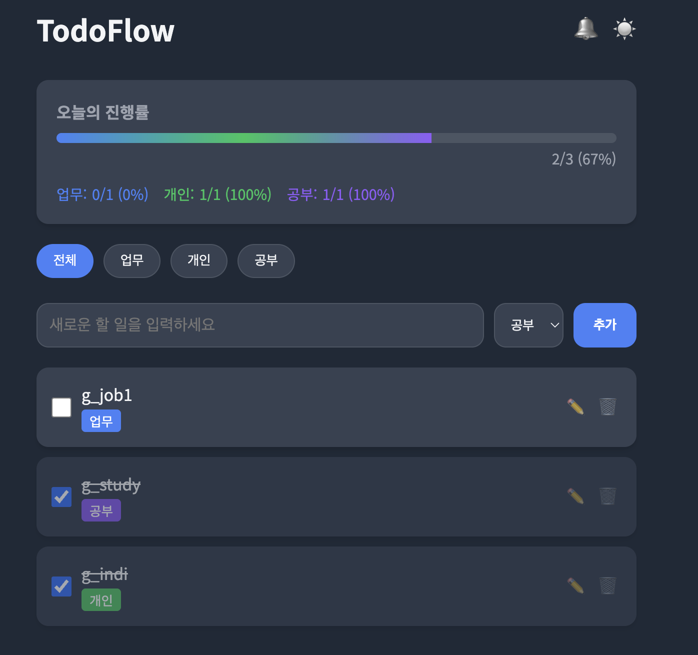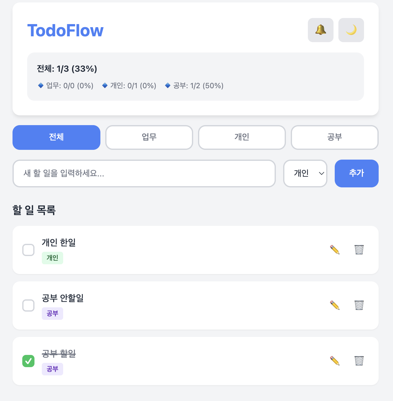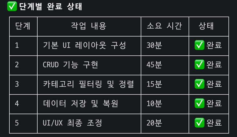 코드 생성은 5단계로 구분하여 단계별 개발 프롬프트는 동일한 것을 사용하였다. 개발 프롬프트는 혼공바이브코딩 도서에서 제공된 PRD를 사용하였다.