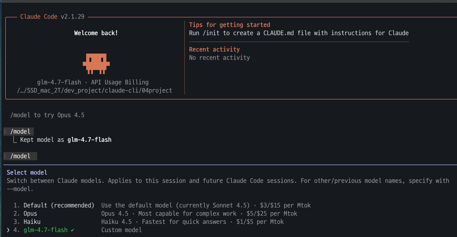 - $ claude --model glm-4.7-flash