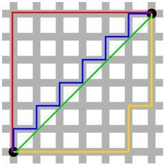 - Euclidean Distance, 유클리드 거리, L2 Distance, 최단 거리 (녹색)